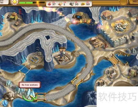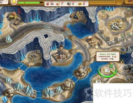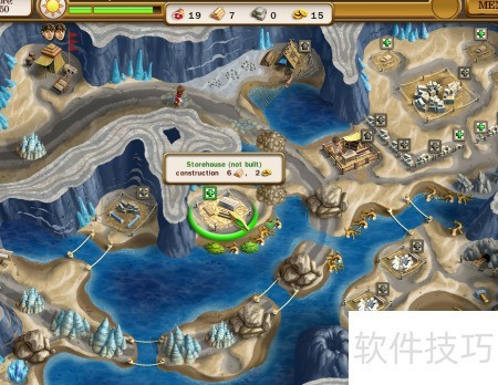 3、 先建中央仓库,修复右侧木桥,随后在右下角建造采石场。