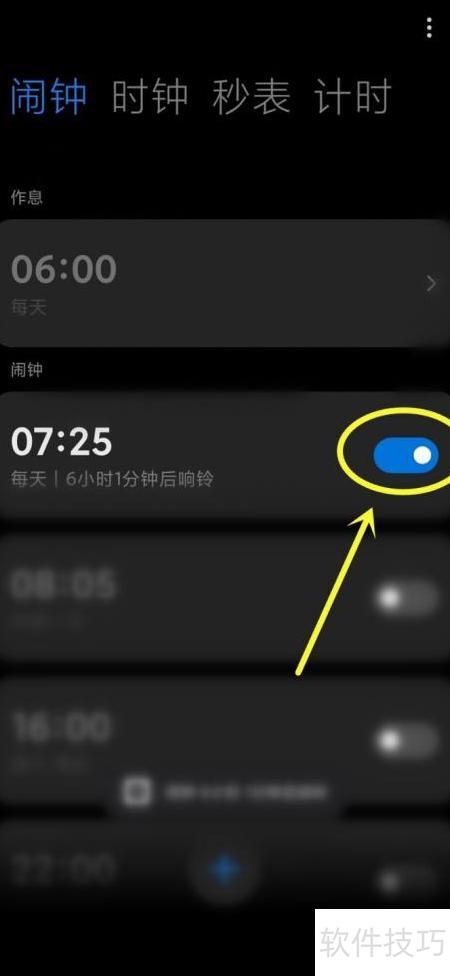3、 进入闹钟页面,开启开关即可设置。