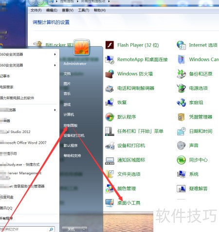 1、 进入控制面板,点击打开,找到桌面小工具并双击启动。