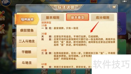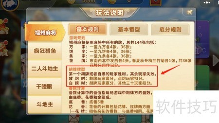 3、 在福州麻将中,首个胡牌或自摸的玩家获胜,其余人则为失败,具体牌型可参考图示说明。