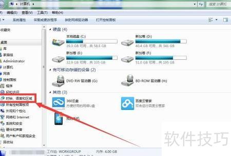 2、 在计算机左侧菜单中进入控制面板,然后选择其中的时钟、语言和区域选项。