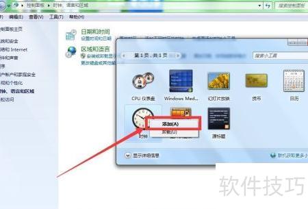 4、 小工具窗口内含多种实用功能,如CPU监控、幻灯片播放和货币换算等。若要在桌面添加时钟,只需右键点击时钟图标,选择添加即可完成操作。