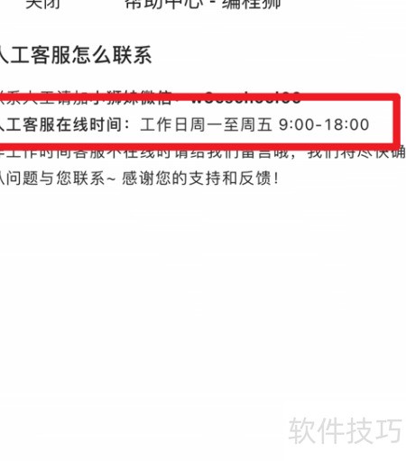 4、 编程狮App人工客服在线时间为工作日周一至周五上午9点到下午6点,可在此查询。