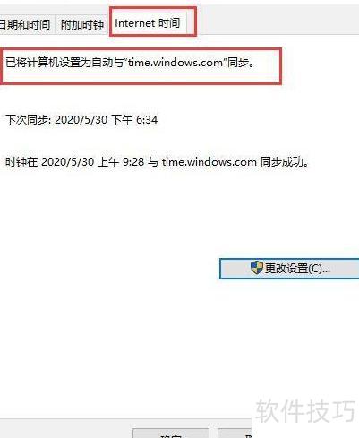 4、 打开日期和时间设置界面,切换至Internet时间选项卡,可查看电脑已自动与网络时间服务器同步。若需调整,点击更改设置按钮进行修改。