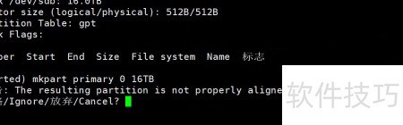 4、 进入parted分区界面后,选择gpt格式,执行mkpart primary指定起始位置为0,结束位置为16TB完成分区。