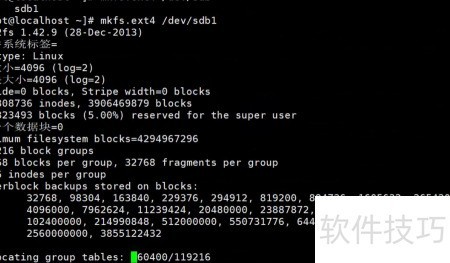 7、 对硬盘进行格式化操作,执行命令 mkfs.ext4 /dev/sdb1。