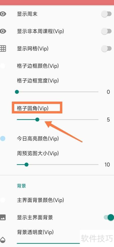 4、 进入课程显示设置,拖动格子圆角下的绿色按钮,调整圆角大小即可。