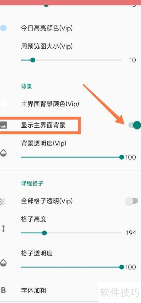 4、 进入课程显示设置,找到显示主界面背景选项,点击其右侧开关按钮并开启即可完成设置。