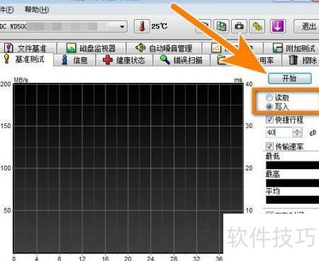 5、 在基准测试界面选择写入功能并点击运行,即可开始检测硬盘的写入速度。