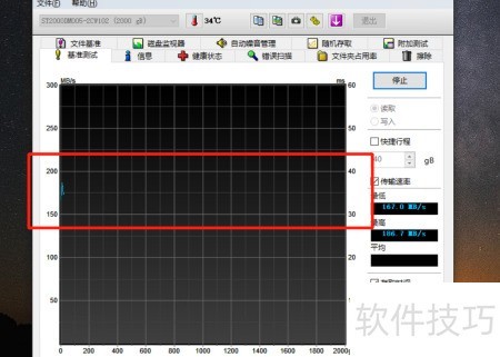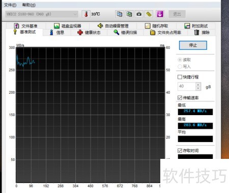 3、 测试开始后,硬盘读写速度稳定在每秒250至300兆之间。