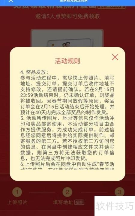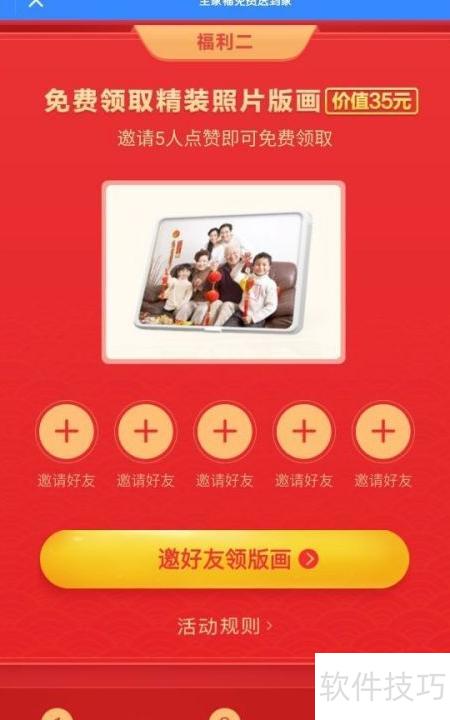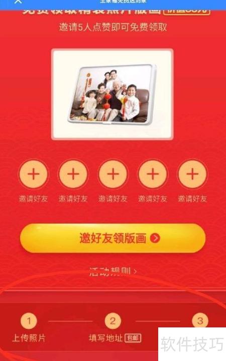 4、 邀请五位好友点赞即可免费领取价值35元的8英寸精装照片版画,每人仅有一次参与机会,成功后可上传一张照片定制专属作品。