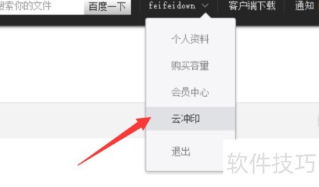 12、 可直接打印百度云网盘图片,也可打印本地计算机照片:点击网盘界面中百度账号旁的下拉箭头,选择云冲印功能即可操作。