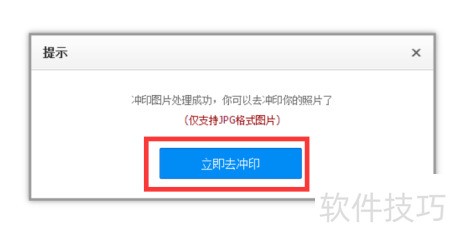 7、 图片处理完毕后,系统将弹出提示窗口,点击立即去冲印即可继续操作。