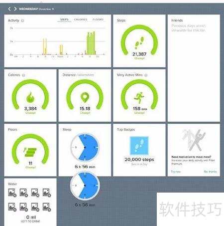5、 Fitbit Force的核心功能在于数据采集,如卡路里消耗、步数等。每个小方格在鼠标悬停时会显示具体百分比数值。例如设定每日步行一万步目标,若实际完成超过两万步,则达成率约为189%。图示颜色随完成进度动态变化:完成率达100%时呈绿色,70%左右为橙色,低于50%则显示红色,直观反映目标完成情况,帮助用户及时调整运动计划,提升健康管理效率。
