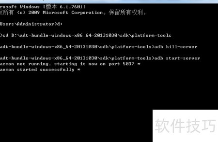 8、 输入adb start-server命令后按回车,运行效果见附图。