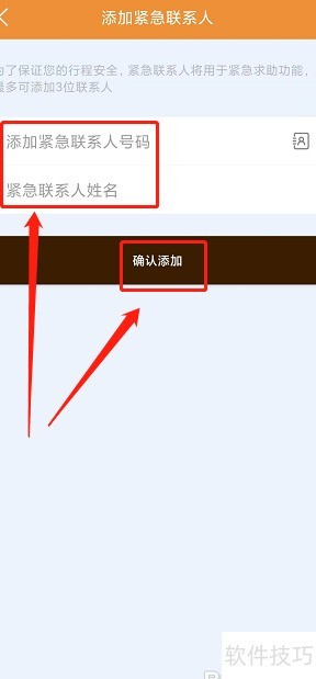 8、 进入紧急联系人添加页面,填写姓名与电话,点击确认即可完成添加。