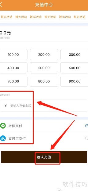 8、 进入充值页面,选定金额与支付方式后,点击确认完成充值。