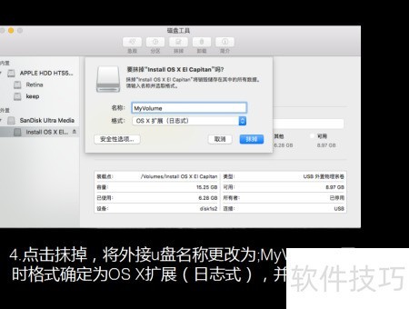 8、 请先备份介质中的重要数据,然后启动磁盘工具对该介质进行抹掉操作。