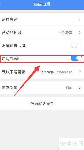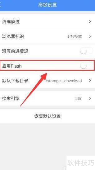 4、 在高级设置界面中,查找并开启启用Flash选项。