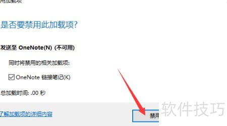 4、 在弹出的确认窗口中选择对应加载项,然后点击底部的禁用按钮即可完成禁用操作。