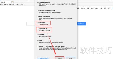4、 勾选历史记录及下载历史,可一并清除相关数据,点击删除按钮即可完成操作。