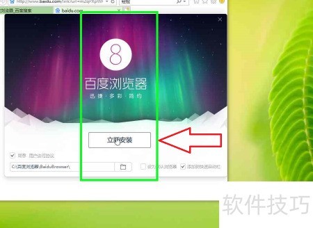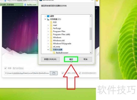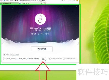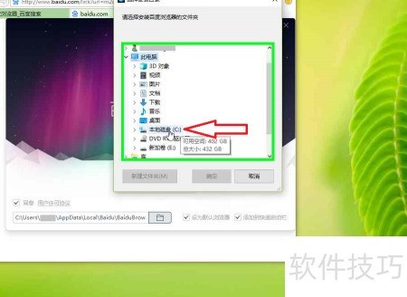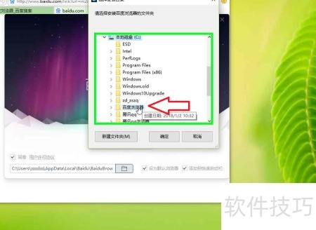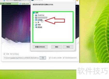 12、 在百度浏览器(树项目)的选择安装目录处点击左键,将软件安装到中文命名的文件夹中,便于日后查找和管理。