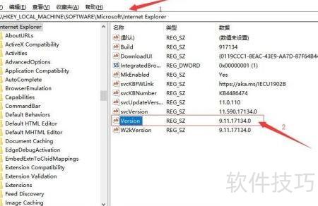 6、 在电脑上打开注册表编辑器,于地址栏输入计算机HKEY_LOCAL_MACHINESOFTWAREMicrosoftInternet Explorer,按下回车键进入,找到名为Version的项,其右侧显示的数据值即为Internet Explorer的版本号信息。