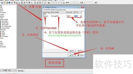 13、 添加设备:选择对应串口,若不确定可查看手机驱动软件信息(本次仅测试室内分布,故只添加手机设备)。