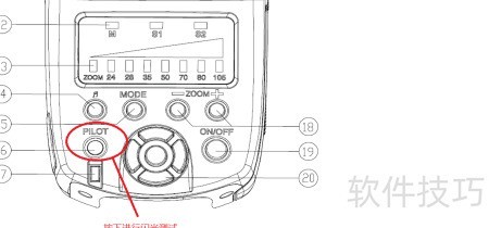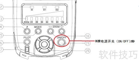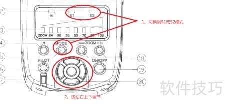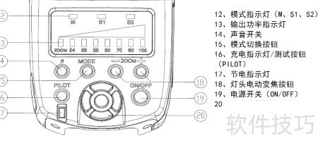 1、 首先了解闪光灯的设置界面,主要包括:模式指示灯(M、S1、S2)、输出功率指示灯、声音开关、模式切换键、充电指示灯兼测试按钮(PILOT)、节能指示灯、电动变焦控制按钮、电源开关(ON/OFF)以及功率调节按钮,各部件协同实现全面操控。