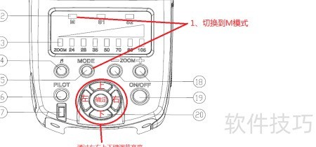 3、 M模式用于调节闪光灯亮度,通过模式切换键进入M模式后进行相应设置。