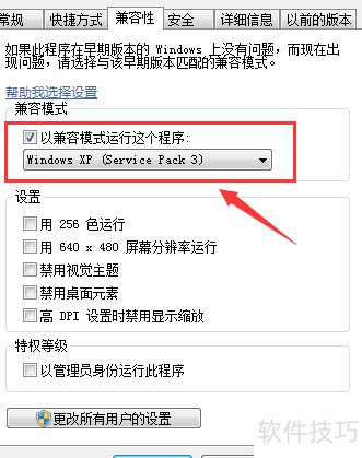 3、 若使用Windows 7或其它版本,右键点击属性中的兼容性选项,将其设置为Vista或XP模式即可。