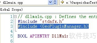 6、 在dllmain.cpp文件中引入头文件,添加声明语句:include 。