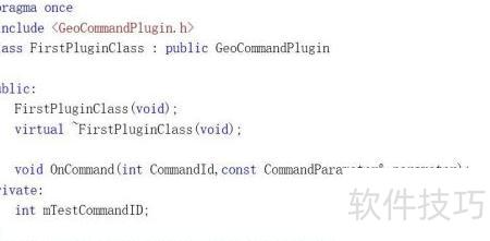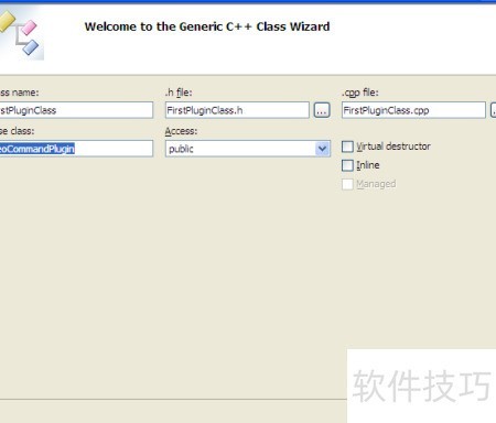 3、 由于需要创建一个继承自GeoCommandPlugin的派生类FirstPluginClass,因此在类名栏中填写FirstPluginClass,基类名栏中输入GeoCommandPlugin,并勾选虚拟析构函数选项,以确保基类的析构函数为虚函数,从而在销毁对象时能正确调用派生类的析构函数,避免资源泄漏,保证程序的稳定性和内存安全。