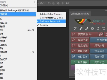 3、 启动Adobe Photoshop CC 2018后,进入窗口菜单中的扩展功能,选择Delicious Retouch 4,即可加载并使用我们汉化的DR4批量磨皮插件,操作简便,功能直观,适合快速进行人像美化处理。