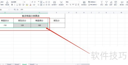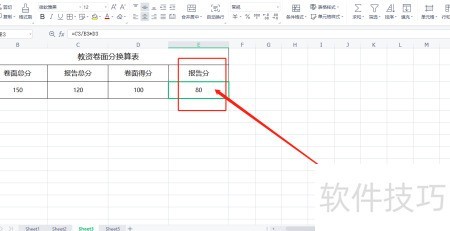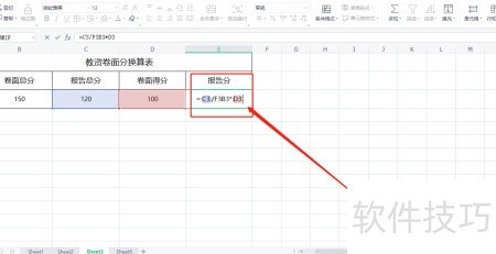 5、 第三,在报告分单元格中,依据卷面总分与报告总分,输入公式=C3/B3*D3进行计算。