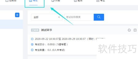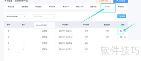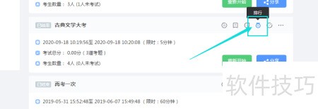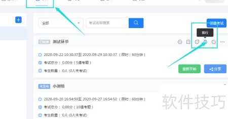 2、 登录系统后,在顶部导航选择考试,将鼠标移至对应考试右侧操作区,点击第四个标记排行即可查看。