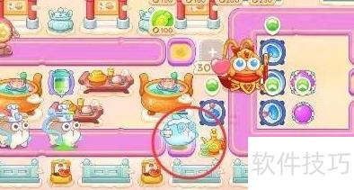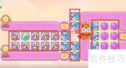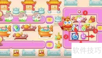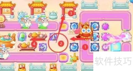 4、 按图示顺序开启,先开右侧中间,再开启左侧和上侧道具,对应位置放置船锚与雷达,随后即可开始打桃子。