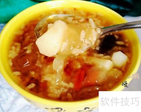 6、 煮好的汤浓稠香甜,口感软糯,满口留香,可随时享用。无论是搭配早餐面包、蛋糕,还是作为饭后甜点,都十分美味可口。