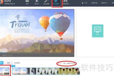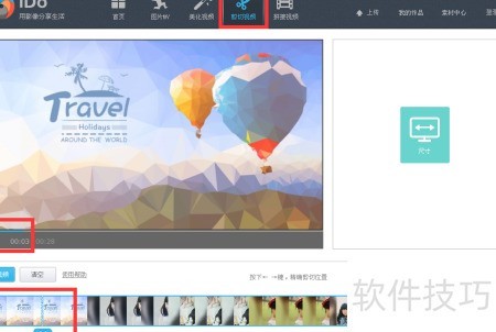 3、 视频添加后自动播放,下方待剪辑的图片同步移动,播放区域会出现一把小剪刀图标。