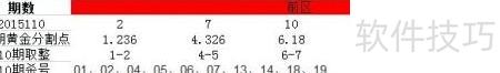 3、 以2015110期为例,对数值进行取整处理:1.236取整为1-2;4.326变为4-5;6.18变为6-7;13.596变为13-14;18.54变为18-19。此方法用于黄金数值的区间划分。