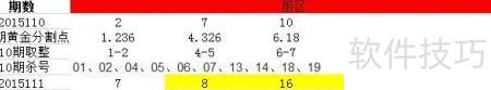 4、 以2015110期为例,通过取黄金分割点的整数值确定杀号,所得杀号集合为:01、02、04、05、06、07、13、14、18、19。