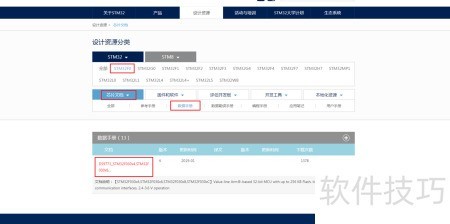4、 在资源分类中选定所需芯片型号,然后浏览该芯片下的各类技术文档,包括数据手册、参考手册、勘误表、编程指南、官方应用笔记及用户手册。例如,查找STM32F0系列的数据手册时,依次选择STM32F0和数据手册,系统将显示对应文件,点击即可跳转下载。