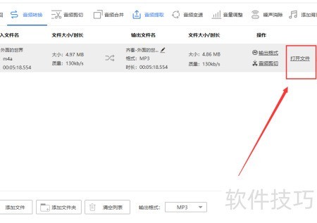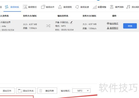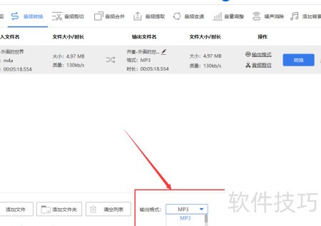 3、 由于需要将m4a格式转换为mp3,我们在输出格式选项中点击并选择MP3即可完成设置。