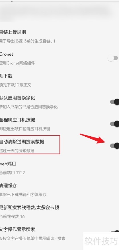 6、 进入其他设置,找到自动清除过期搜索数据选项,点击右侧开关开启即可。