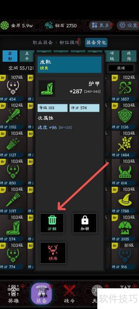 4、 进入皮靴装备详情页,点击分解功能即可完成操作。