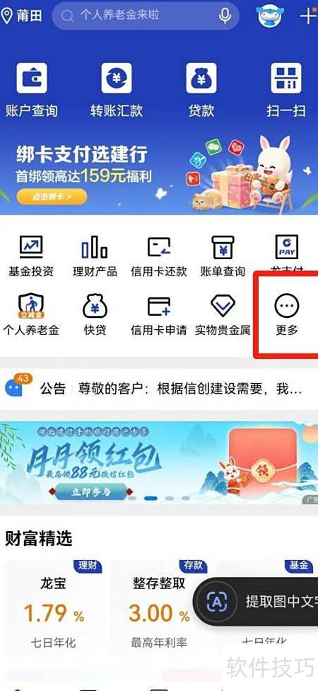1、 打开建行APP,选择更多功能选项