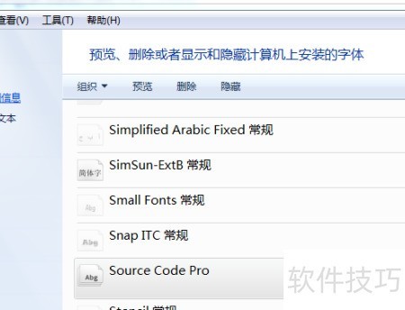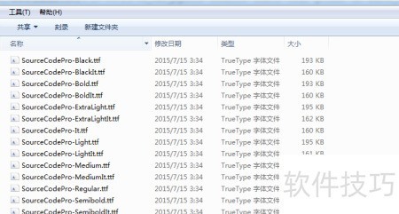 2、 进入TTF文件夹,将所有以.ttf为扩展名的文件复制到C盘Windows目录下的Fonts文件夹中。复制结束后,系统字体列表中会显示Source Code Pro字体,出现在Windows字体分类下,即表示该字体已成功安装并可正常使用。