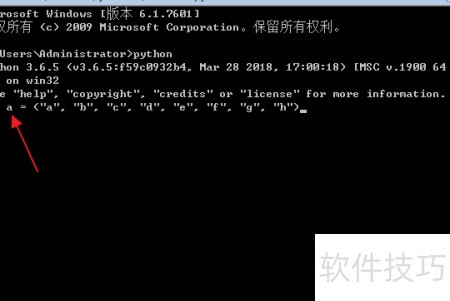 4、 在Python环境中输入 a = (a, b, c, d, e, f, g, h),然后按下回车键执行该语句。