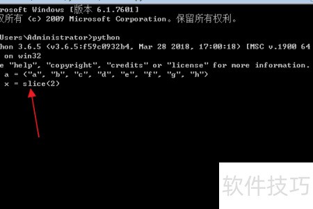 5、 在Python环境中输入x = slice(2),然后按下回车键执行。