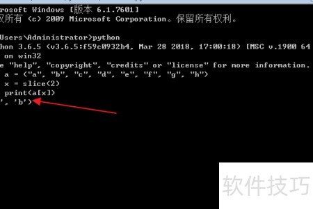 7、 按下Enter键,利用Python内置的slice()函数创建切片对象,可提取元组中前两个元素。